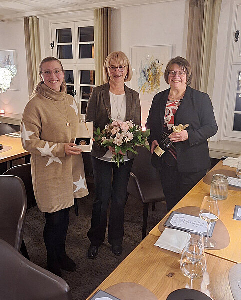 Marina Trommer (li) und Karin Gremminger-Trommer (re) verabschieden Monka Gal mit Geschenken in den Ruhestand.